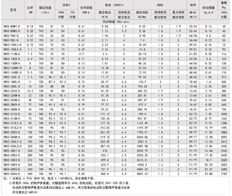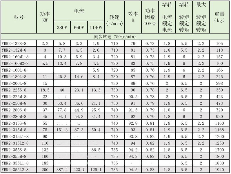 7. The relationship between the rotation speed of the explosion-proof motor and the number of poles, unit: r/min: the rotation speed of the 2-pole (P) explosion-proof motor is 3000r/min; the rotation speed of the 4-pole (P) explosion-proof motor is 1500r/min; 6P ( The rotation speed of the explosion-proof motor is 1000r/min; the rotation speed of the 8P (pole) explosion-proof motor is 750r/min; the rotation speed of the 10-pole (P) explosion-proof motor is 600r/min;