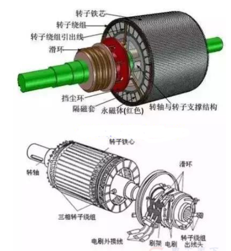 The three-phase asynchronous motor is composed of two parts: the stator and the rotor. The stator is the fixed part of the motor and is used to generate a rotating magnetic field. It is mainly composed of the stator core, stator windings, base and other components. The rotor is the rotating part of the motor, consisting of the rotor core, rotor windings, rotating shaft and other components. Its main function is to obtain rotational torque under the action of the rotating magnetic field. The difference between wound motors and squirrel cage motors Rotors are divided into two types: squirrel-cage rotors and wound rotors according to different structures: 1. Squirrel cage rotor The rotor winding consists of multiple guide bars inserted into the rotor slots and two circular end rings. If the rotor core is removed, the entire winding looks like a squirrel cage, so it is called cage winding. Small and medium-sized rotors generally use cast aluminum. For motors above 100KW, they are welded with copper bars and copper end rings. The number of rotor phases of a squirrel-cage asynchronous motor is the number of conductors on the squirrel-cage rotor, and the number of turns per phase is equal to 1/2 turns. The rotor winding does not need to be insulated from the ground. The number of rotor pole pairs is obtained by the asynchronous magnetomotive force of the stator winding. Therefore, it is always equal to the number of pole pairs of the stator winding and has nothing to do with the number of conductors of the squirrel cage rotor. Squirrel-cage rotor, as shown in Figure 3-4. This rotor is installed in the rotor core slot with copper bars, and the two ends are welded with end rings. It is shaped like a squirrel cage.