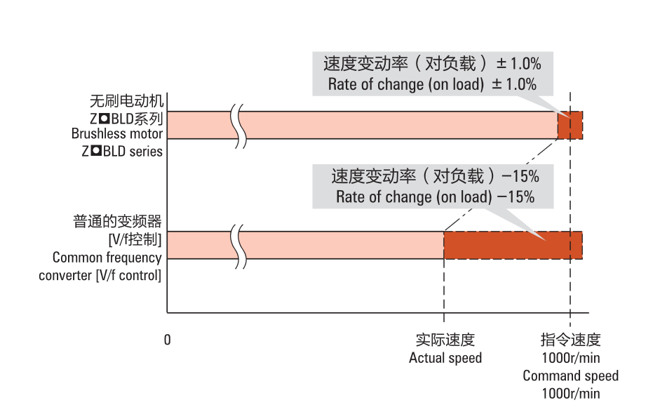 Brushless motors continuously compare the set speed with the speed feedback signal from the motor to adjust the voltage applied to the motor; therefore, even if the load changes, it can still adjust from a low speed to the set speed instantly and run at this stable speed. Three-phase induction motors controlled by inverters do not perform feedback control, so the speed will drop significantly when the load increases.