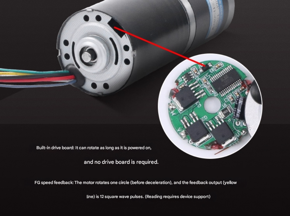 5. Speed control: reverse speed control through PWM mode (duty cycle); connect to the negative pole of the power supply (0V) at full speed. Blue line