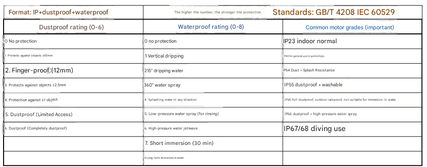 The classification of motor protection ratings primarily relies on the International Classification of Protection (IP) standard. The IP standard is a standard used to classify and specify the level of protection that electrical equipment can withstand against external objects and moisture. This standard was developed by the International Electrotechnical Commission (IEC) and is widely adopted globally. An IP rating consists of two digits: the first indicates the dustproof rating, and the second indicates the waterproof rating. Each digit has a specific meaning.