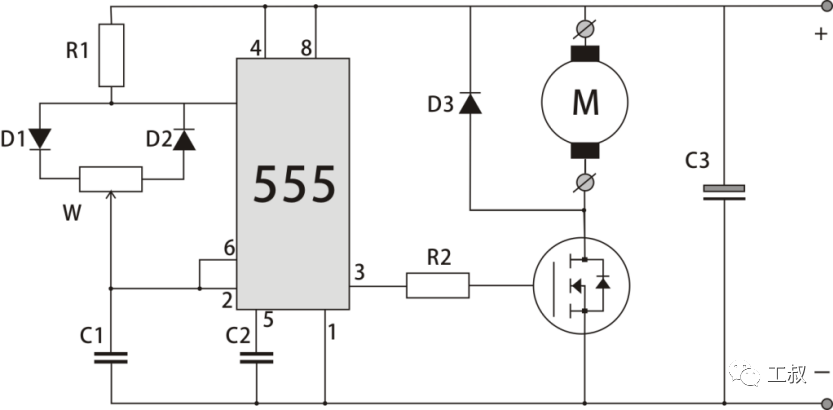 The circuit composed of 555 chips in the figure is used to generate PWM (pulse width modulation) signal, and then drive MOSFET field effect tube to control the power of the motor.