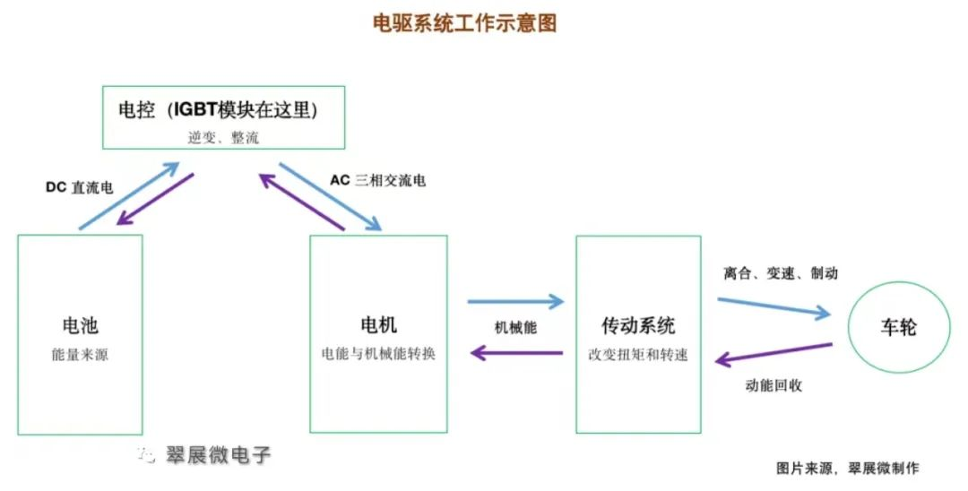 To understand the IGBT module, you must first understand the electric drive system of new energy vehicles. First, summarize how the electric drive system works in one sentence: When driving a new energy vehicle, the motor controller converts the direct current (DC) released by the power battery into Alternating current (AC) (this process is inverter) makes the drive motor work, the motor converts electrical energy into mechanical energy, and then makes the wheels of the car run through the transmission system (mainly the reducer). Conversely, the process of converting and storing the mechanical energy of the wheels into the battery is kinetic energy recovery.
