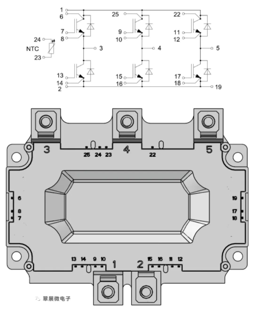 1 is DC positive, 2 is DC negative; 3, 4, 5 are the U, V, W interfaces of the three-phase AC; 6, 25, 22 are the signal terminals of the collector, 7, 9, 11, 13, 15, 17 8, 10, 12, 14, 16, 18 are emitter signal terminals; 19 are DC negative signal terminals; 23, 24 are NTC thermistor terminals.