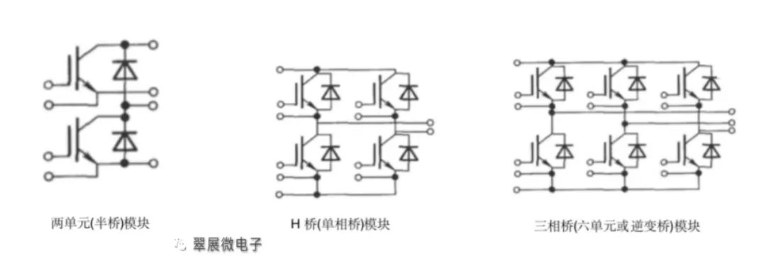 As shown in the figure above, in the IGBT module/single tube, the first unit is generally referred to as an IGBT single tube, the second unit is a single bridge arm (half bridge), the fourth unit is an H bridge (single-phase bridge), and the sixth unit is a three-phase bridge. (full bridge), seven units are generally six units + a braking unit, and eight units are generally six units + braking unit + pre-charging unit.