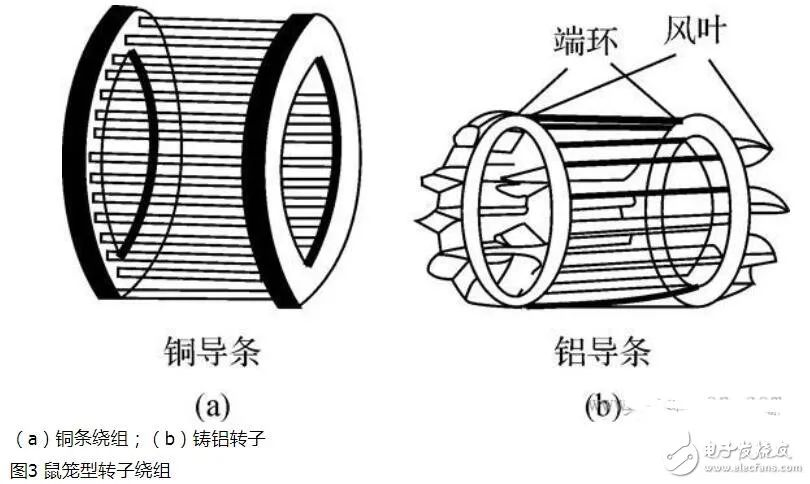 The structure of the squirrel-cage rotor winding is quite different from that of the stator winding. There are also slots on the rotor core, and there is a guide bar in each slot. There are two Swiss rings at both ends of the iron core, which respectively connect all the parts of the guide bars protruding from the groove to form a short circuit. If the rotor core is removed, the windings are shaped like a mouse cage, as shown in Figure 3(a). The material of the guide bar is copper or aluminum. If it is made of copper, it is to insert the pre-made bare copper strips into the rotor core slot, and then use copper rings to cover the heads of the copper strips at both ends, and weld them together; if it is made of aluminum windings, it is The melted aluminum liquid is directly cast in the rotor core slot, together with the ring and the fan blades, as shown in Figure 3(b).