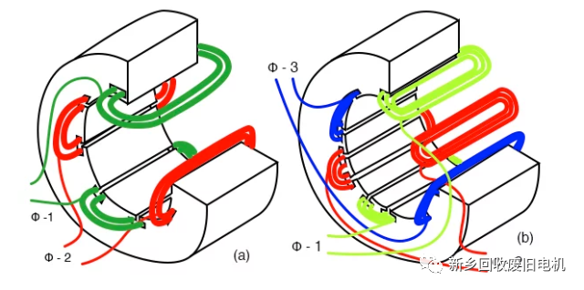 Winding connection methodIn a salient pole motor, the magnetic poles can be produced by windings wound under the pole face, and in non-salient pole configurations, the windings can be dispersed within the pole face slots. A typical shaded pole motor consists of windings placed around a pole that supports the phase of the magnetic field. Some types of motors include conductors, which are made of thick metal sheets. The metal strips are usually made of copper or aluminum. Depending on the type of starting method used for the motor, the three phase windings of the motor are connected in star or delta. Motors such as squirrel cages can frequently run on rails via a star connection to a triangular stator.The windings of both two-phase and three-phase motors are installed in stator slots. The coils are wound around external fixtures and then wound into the slots. An insulation layer sandwiched between the coil periphery and the slots prevents wear. Windings are made of copper wire wound around an iron core and are used to create or obtain electromagnetic energy.The most commonly used winding material is enamel paint-wrapped copper or aluminum wire, consisting of a set of coils in slots and teeth in the edge area of the windings. In large motors, the pole windings are divided into bundles of identical coils, which are inserted into smaller slots. The groups are called phase strips (see figure below). The distributed coils of the phase band cancel some odd harmonics and produce a sinusoidal magnetic field distribution on the magnetic poles. Since the phase bands can overlap, slots at the edge of a pole may have fewer turns than other slots, and edge slots may contain two-phase windings.