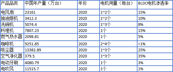 According to a data table on the penetration rate of BLDC motors in home appliances compiled by the National Bureau of Statistics, China Customs and electronics enthusiasts, it can be found that the penetration rate of BLDC motors in various home appliances products still has a large inventory space. Especially among home appliances with a penetration rate of less than 20%, such as range hoods, dishwashers, gas water heaters, hair dryers, and electric toothbrushes, the penetration stock of permanent magnet BLDC motors is still about 80%.