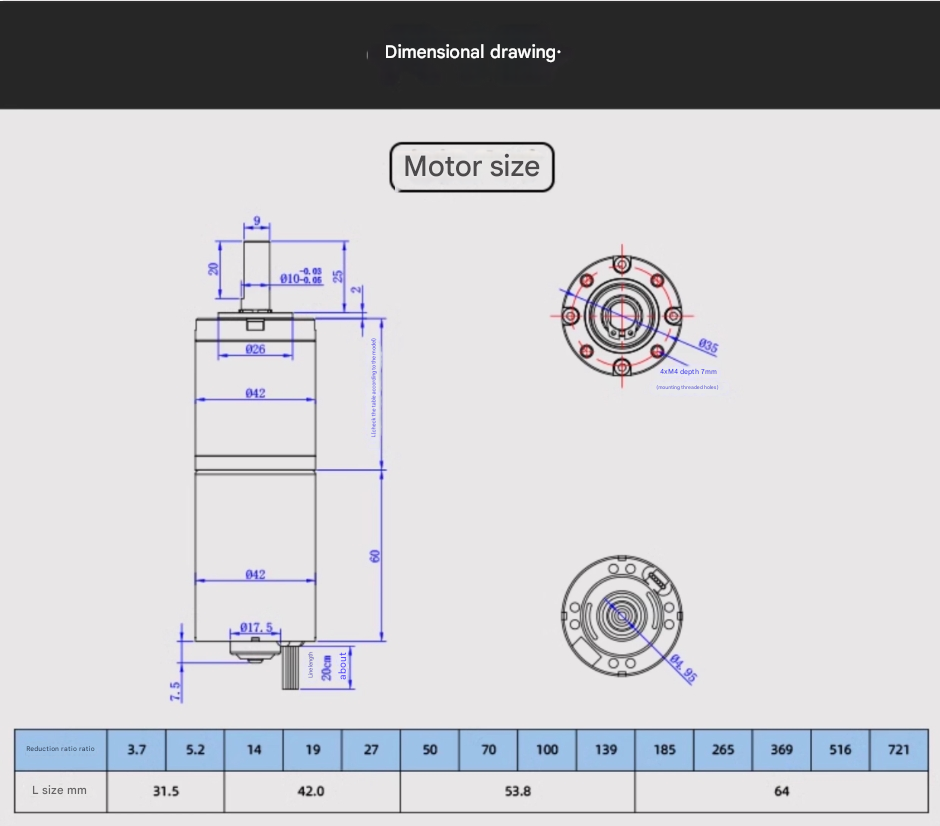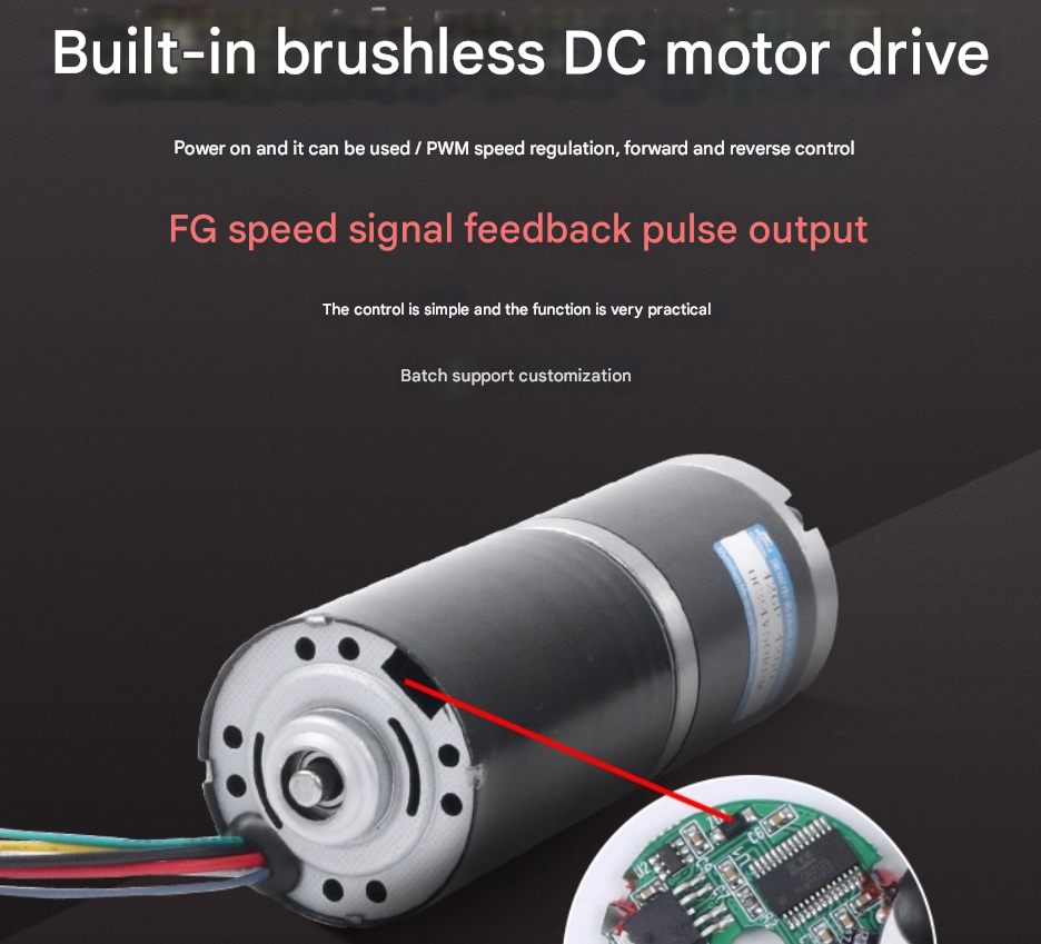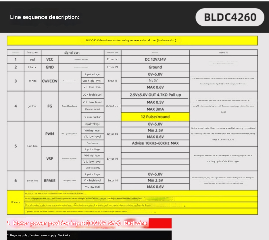 5. Speed control: reverse speed control through PWM mode (duty cycle); connect to the negative pole of the power supply (0V) at full speed. Blue line