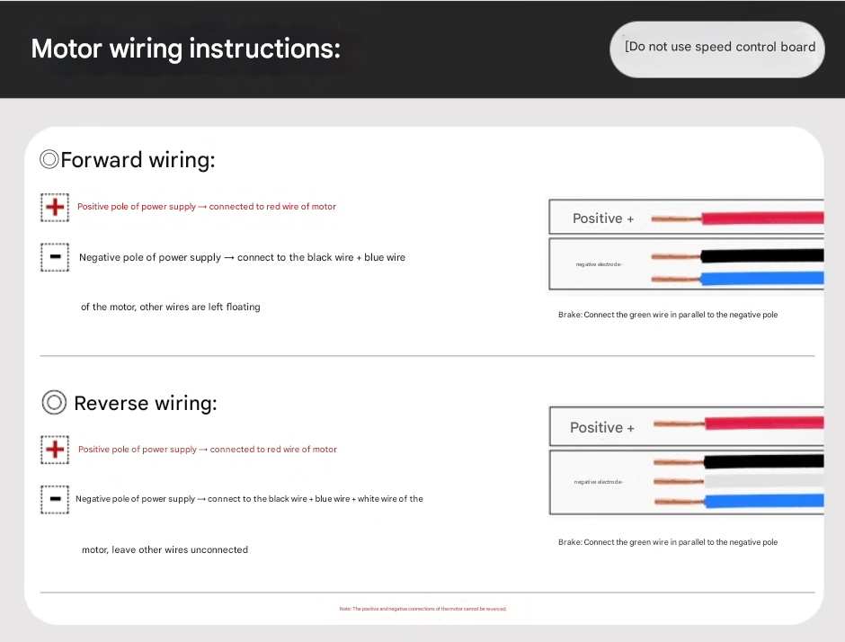 Please do not connect the wrong wires, as wrong connection will cause the motor to burn out, and the warranty will be void after burning!!