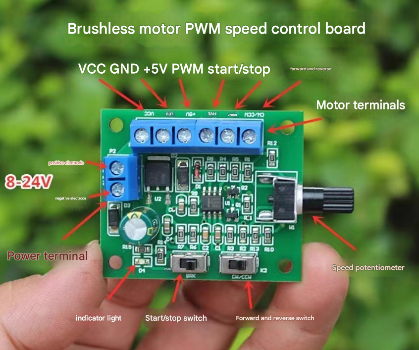 You need to purchase a brushless motor PWM speed control board and prepare a DC12V power supply;